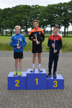 Bij de jongens was het Ties Snippert (KV Java) die zijn veelzijdigheid bewees met winst op straat, en podiumplaatsen op veld en zetten. Hij werd daarmee allroundkampioen. Wout van der Aa (KV Oud-Ootmarsum) gooide een opvallend sterke straatronde (11 meter in 6 schoten) en won daarmee goud op dat onderdeel. Jordy Niehof (KV Lattrop-Breklenkamp) pakte winst op het zetonderdeel.